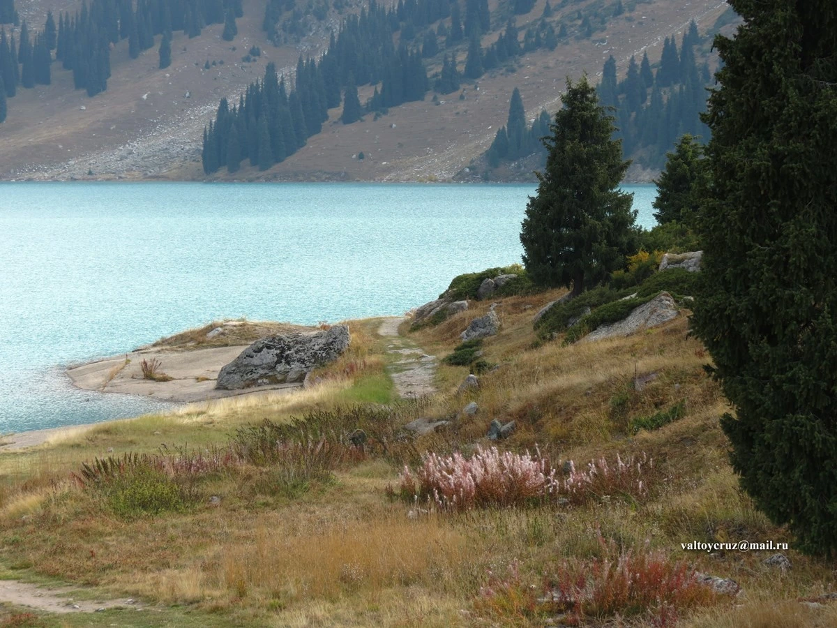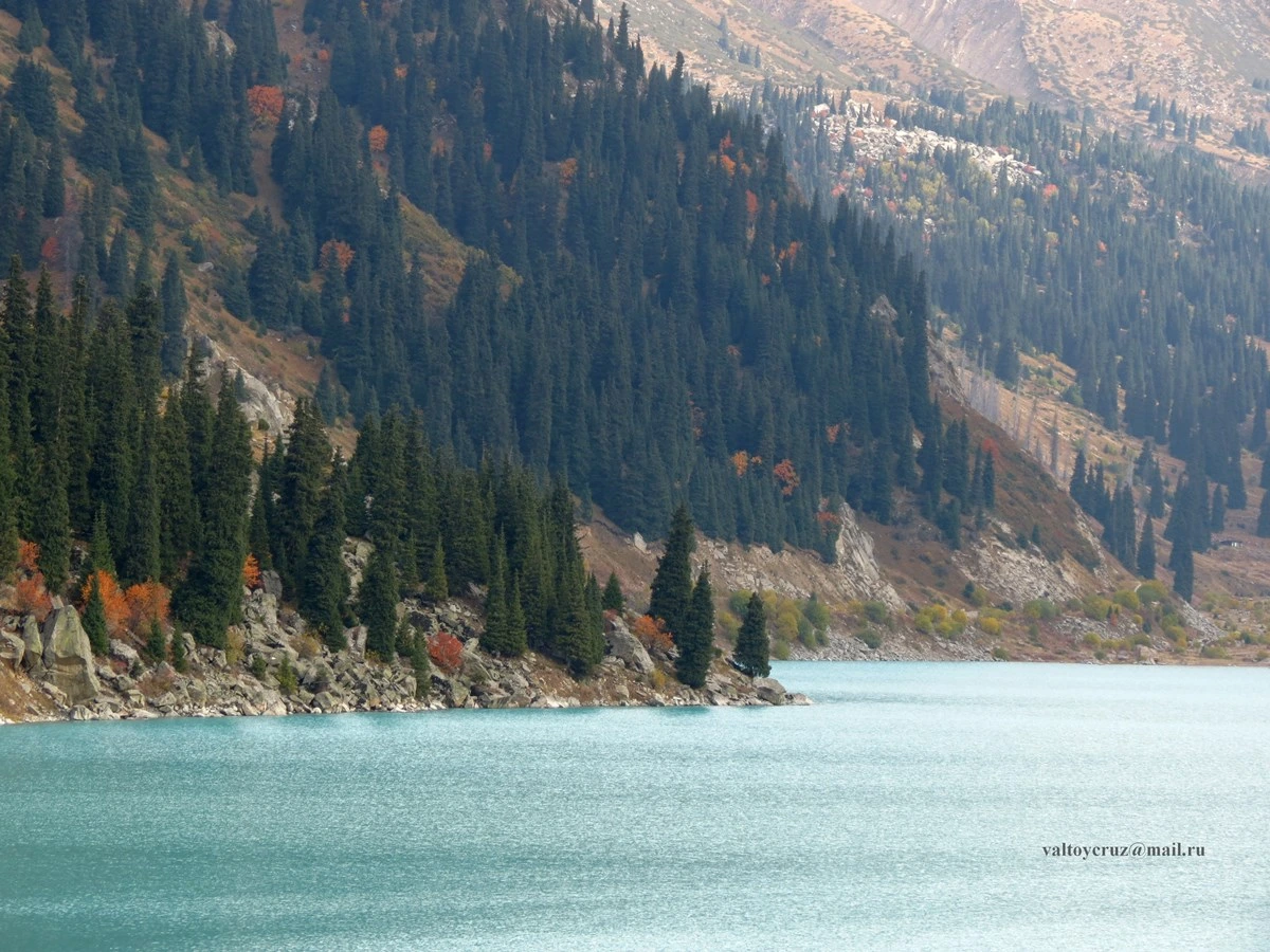 ✔ Невероятные пейзажи – бирюзовая вода озера меняет свой оттенок в зависимости от времени года и погоды, на фоне возвышаются знаменитые пики: Озёрный (4130 м), Советов (4 317 м) и гигантский пик Большой Алматинский (3 681 м).