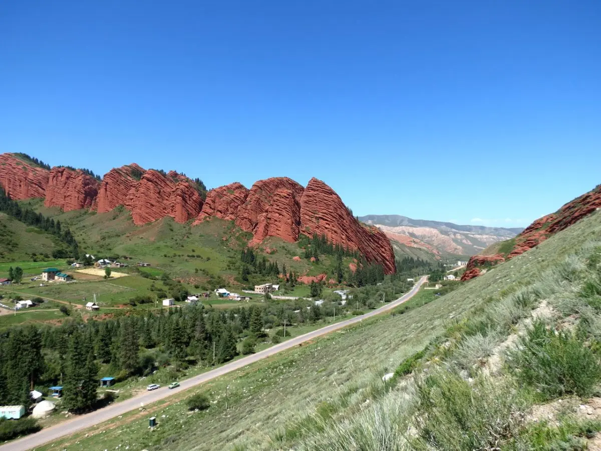 Ущелье Джеты-Огуз располагается в 30 километрах от Каракола. Если переводить дословно с киргизского языка от оно означает «семь быков». Своим названием ущелье обязано веренице выветренных красноватых скал, которые издали напоминают отдыхающих на земле быков. Такая необычная природная архитектура и является главной «изюминкой» местечка Джеты-Огуз.