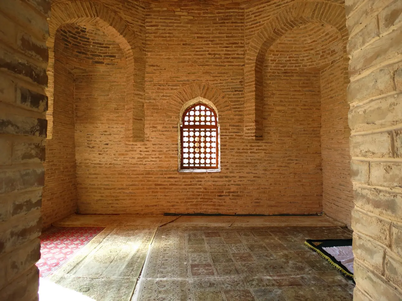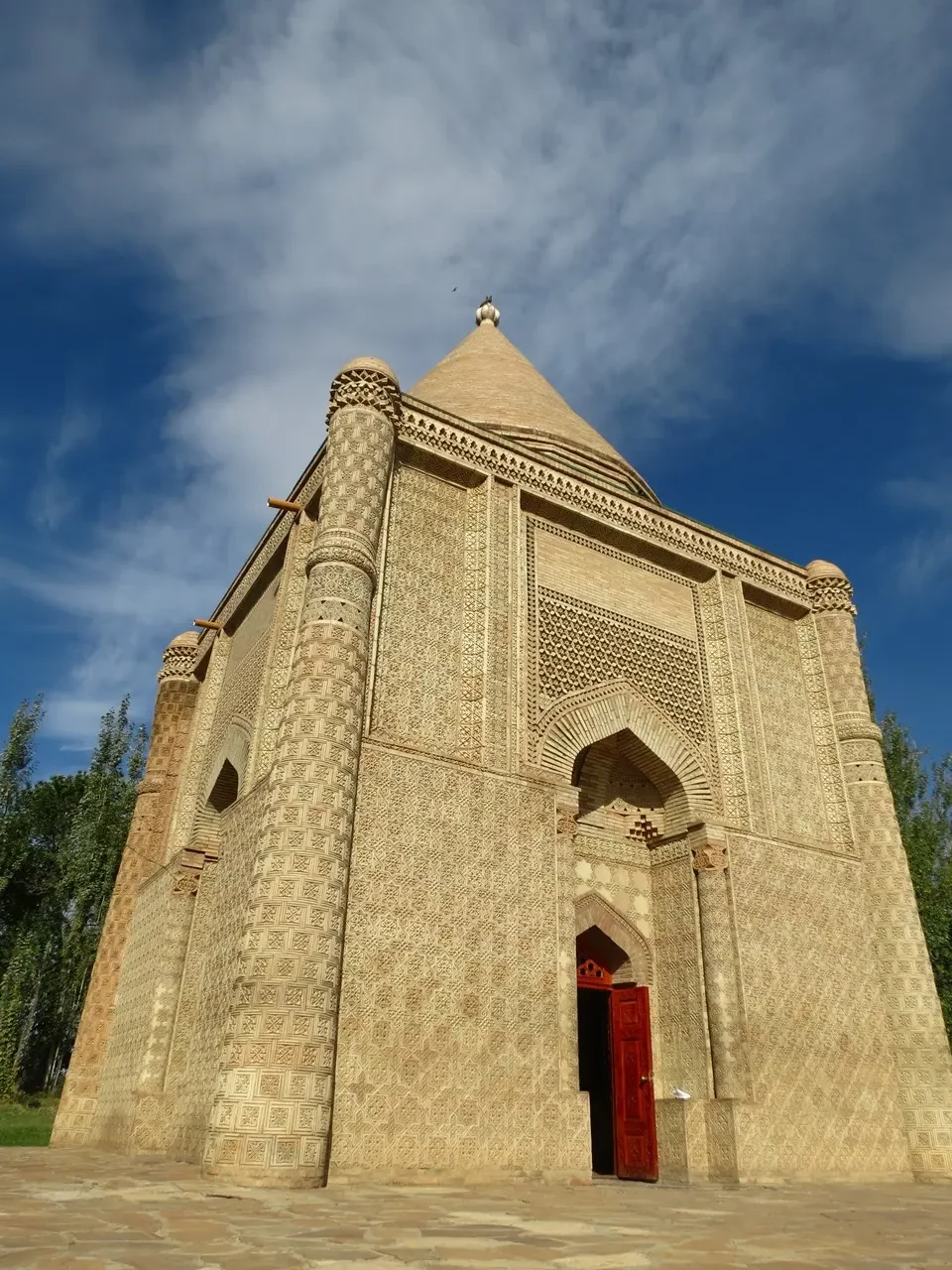 Если присмотреться к узорам, то увидите нотки традиционного орнаментального искусства древнейших казахстанских племен. Они включают мотивы, чьи корни уходят еще в искусство сакских племен. Что касается самого процесса строительства мавзолея, то каких-то точных данных нет. Есть только легенда о любви красавицы Айши Биби к своему избраннику. Причем она насчитывает более 28 самых разных версий. Наиболее распространенная легенда гласит, что Айша Биби приходилась дочерью знаменитому учённому и поэту 11 века Хакиму Сулеймену Бакыргани. Когда отец умер, девушка воспитывалась при дворе шейха Айкожы. Однажды на красавицу положил глаз воинственный правитель Тараза Карахан Мухаммед. Несмотря на достойное предложение, воспитатель Айши Биби отказал ему в женитьбе. Девушка решила тайно переехать в Тараз, однако по пути погибла. На берегу реки Аса её укусила змея, которая была спрятана в головном уборе. Скорбящий правитель возвел в честь любимой девушки роскошный мавзолей. Причем сделал это в том месте, где змея совершила смертельный укус. Попутчица Айша Биби Бабаджи Хатун стала хранительницей мавзолея и после смерти была похоронена в 20 шагах от неё в мавзолее «Бабаджи Хатун»
