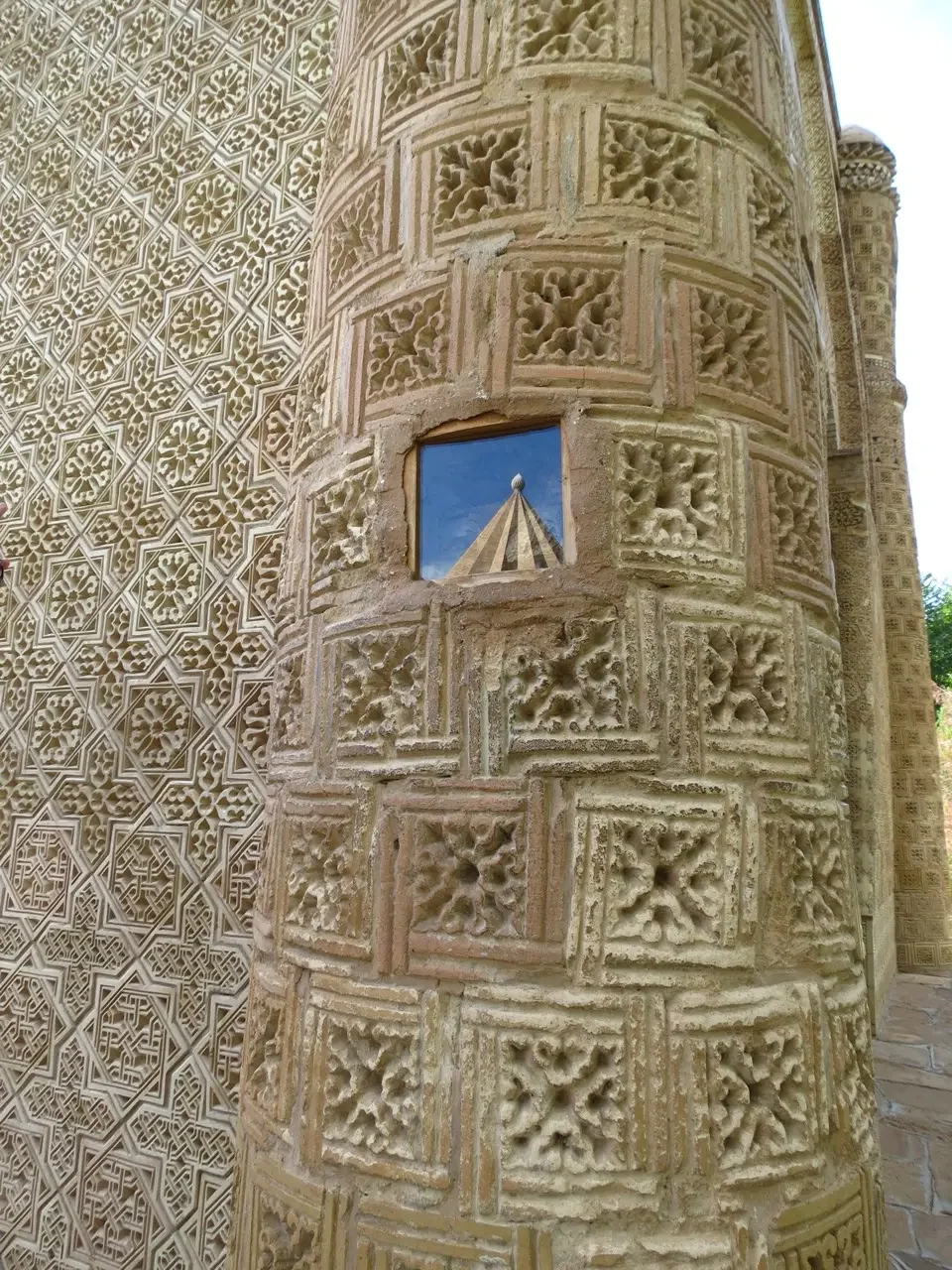 Их поражала необычная форма объекта и его интерьер. Основной ход располагался в северной части. С него можно было попасть во двор с двумя овальными водоемами (хаузами). Вокруг них сохранились основания 28 мощнейших колонн. К колоннаде примыкало около ста помещений. Исследователи отмечали очень сложную и продуманную систему коридоров, которые соединяли помещения.