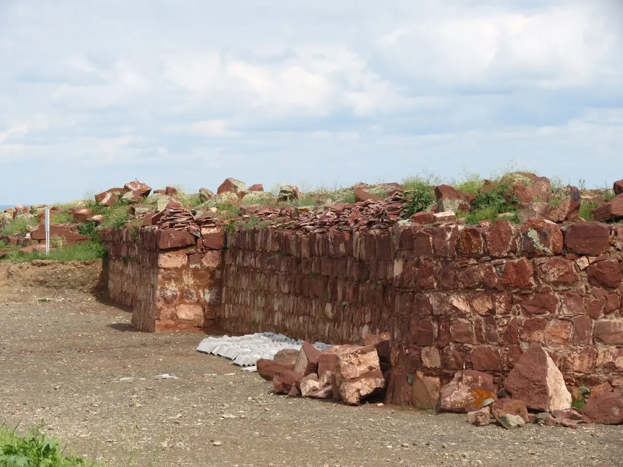 Еще один примечательный факт – с внешней стороны оборонительных сооружений нет. Внутренние помещения оснащались покрытием куполообразной формы. Освещение осуществлялось через люки (они находились в каждом из куполов). Высота стены доходила до 2 метров. Эксперты, изучавшие городище, отметили методику кладки. Использовались даже кирпичи, поставленные ребром. При расчистке стены на западе были обнаружены так называемые «шубы» из камня. Они были выложены из маленьких камней, чья толщина не превышала 10 сантиметров. Благодаря такой конфигурации наружная стена была надежно защищена от непогоды. Хотя в то время подобные кладки «шубы» нигде не встречаются.